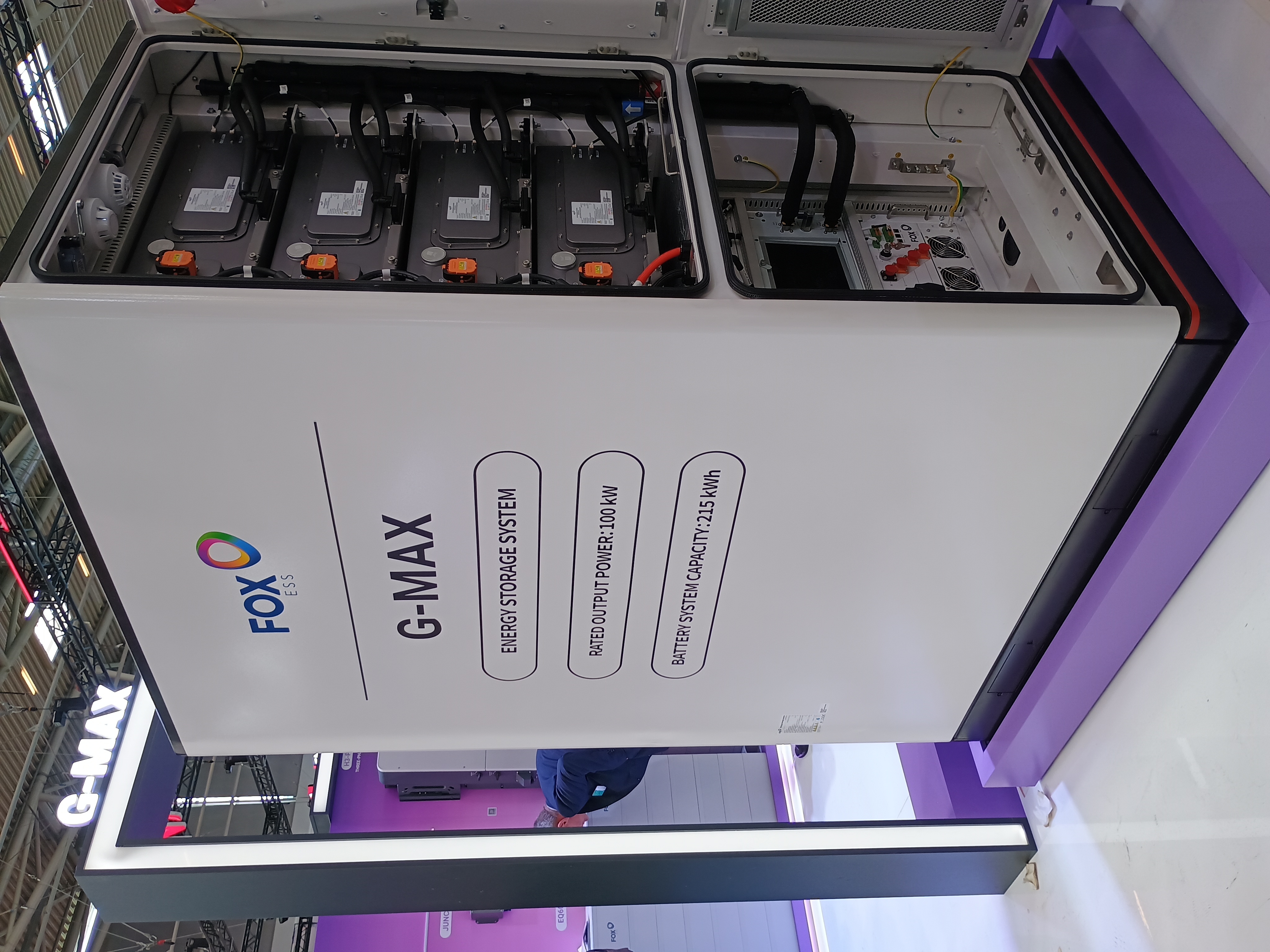 - Fox ESS G-Max All In One: Der leistungsstarke, flüssigkeitsgekühlte Gewerbespeicher (215 kWh / 100 kW Ausgangsleistung) ist das C&I-Flaggschiff auf der Intersolar 2025. Das System ist vorkonfiguriert und die Module und Kühlsysteme bereits verkabelt. So musst du nur den AC-Anschluss vornehmen und den Speicher über das EMS in Betrieb nehmen.