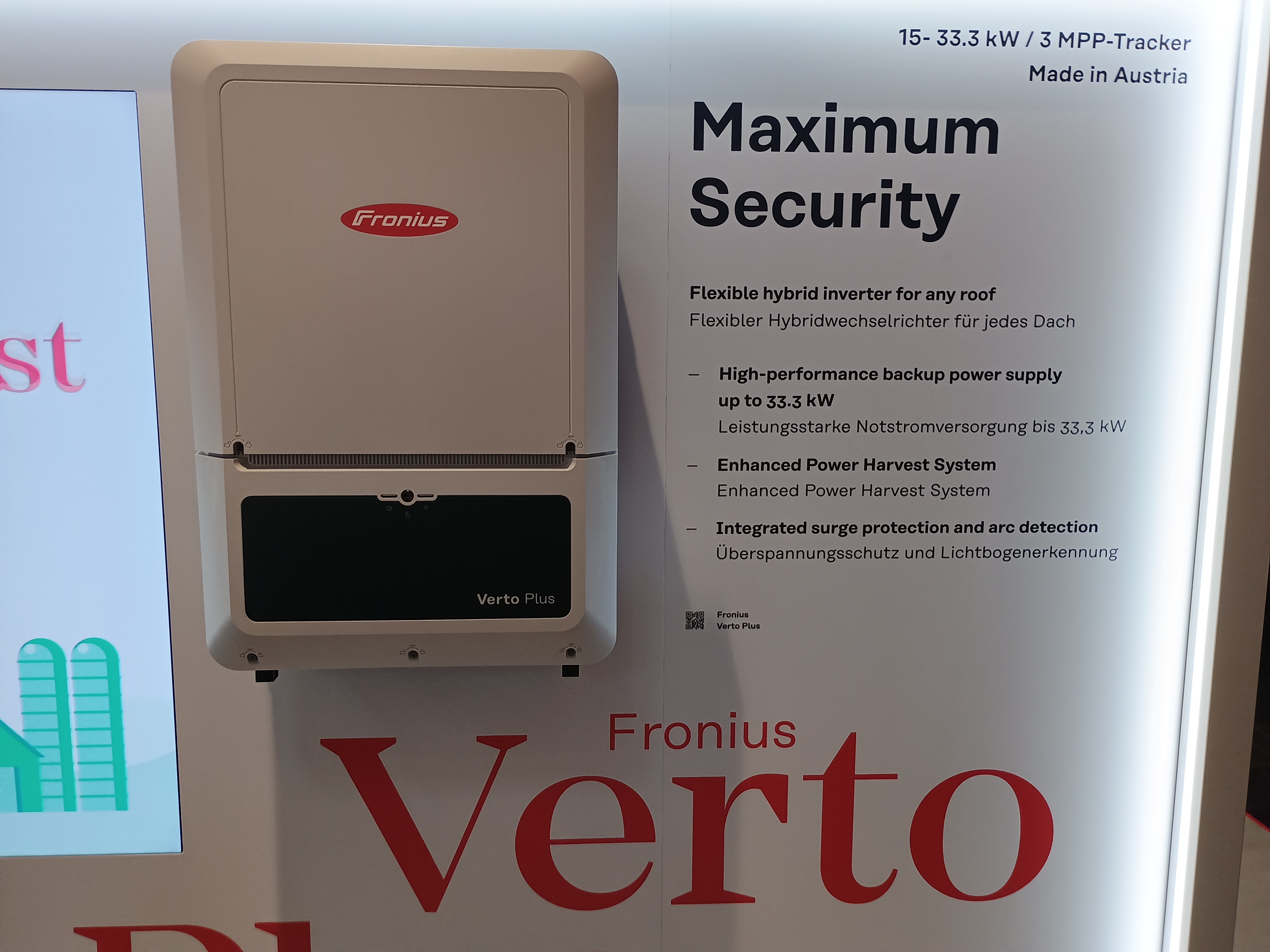 - Fronis Verto Plus: Die Hybrid-Version des neuesten Fronius Wechselrichters ist mit einer Leistungsklasse von 15–33 kW für große Häuser und Kleingewerbe ausgelegt. Mit 3 MPPTs und eigenem Batterie-Eingang eignet sich der Hybrid besonders für komplexe Dächer und landwirtschaftliche Anwendungen mit mehreren PV-Anlagen. Integrierte Lichtbogenerkennung & Backup-Leistung bis zur Nennleistung runden das moderne Wechselrichter-Paket ab.
