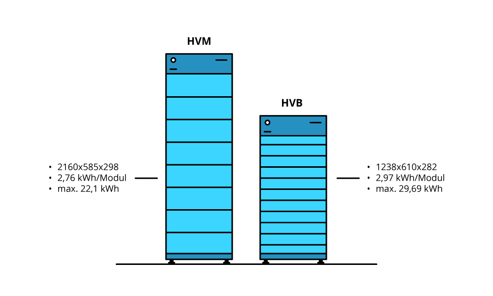 Durch die hohe Energiedichte erreichten HVB Speicher bis zu 30 kWh Speicherkapazität auf nur 1,30 m Höhe.